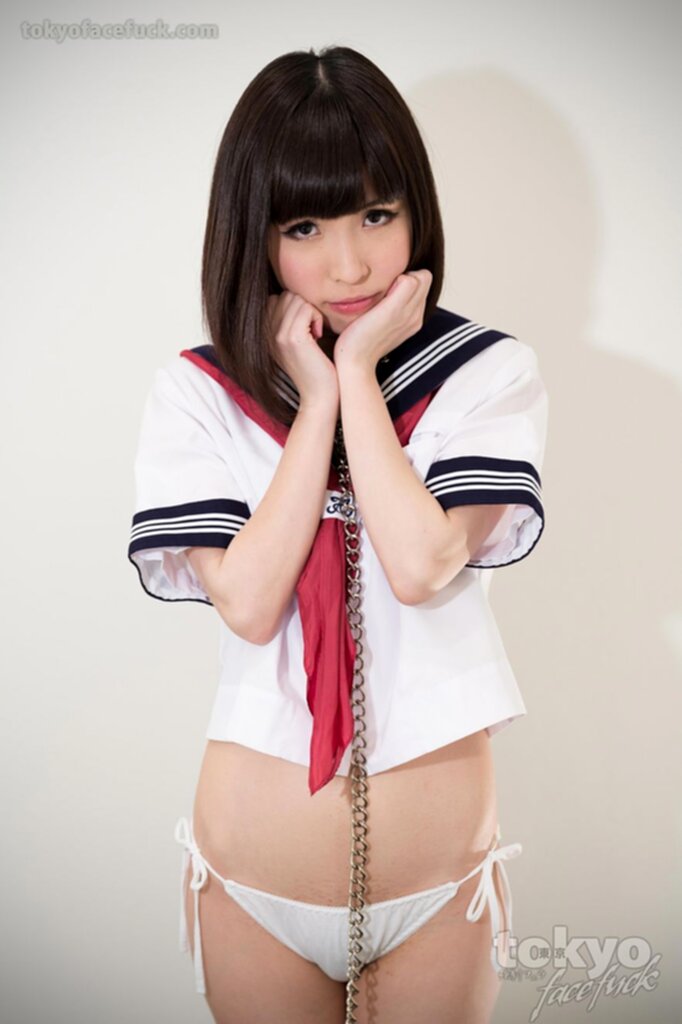 Kogal in uniform hands raised wearing bondage chain white panties